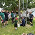 Selbst die Kleinsten halfen mit: Gemeinsam schmückten Mitglieder der Sankt Antonius Schützenbruderschaft und des Spielmannszuges „Blau-Weiß“ Hartefeld das Dorf und installierten die Schießanlage auf der Wiese am „Alten Pfarrhaus“. Für das Vogelschießen am Sonntag ist alles bereit.