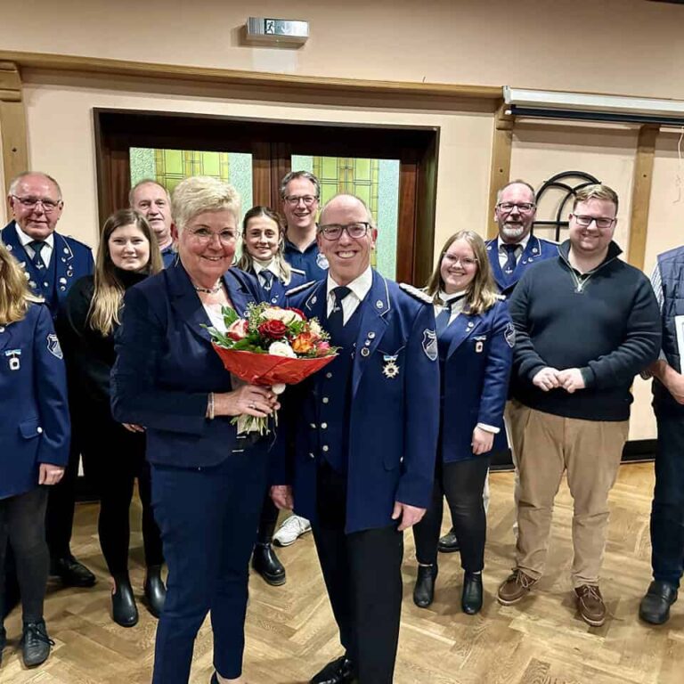 Stellten sich gemeinsam mit dem Vorstand des Spielmannszuges „Blau-Weiß“ Hartefeld zum Erinnerungsfoto (vorn Mitte): Gabi Kisters, die vom…