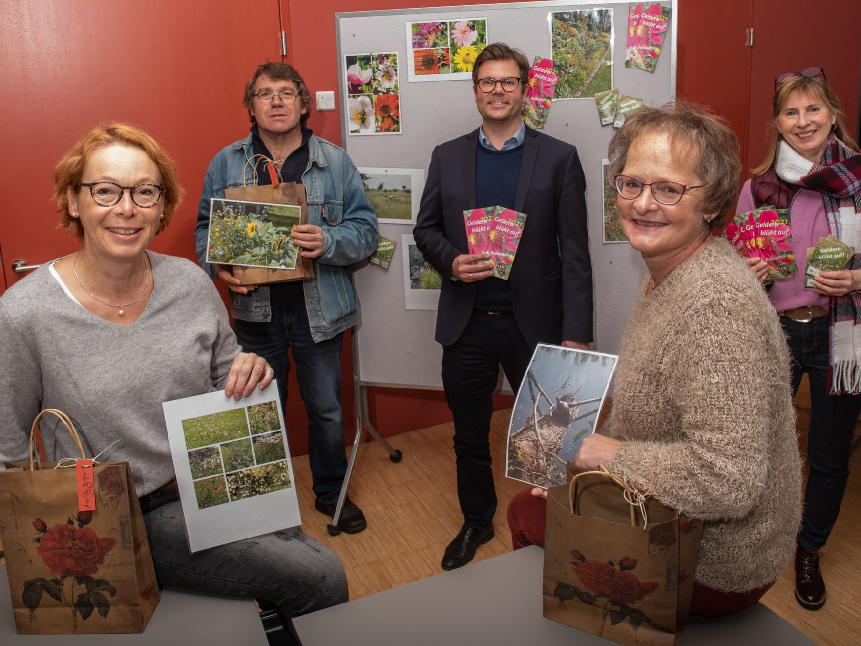 Die Stadt Geldern hatte dazu aufgerufen, sich an einer Fotoaktion unter dem Titel „Geldern blüht auf! Mach mit!“ zu beteiligen – eine Aktion, zu der Gelderns ehemalige Umweltschutzbeauftragte Dr. Sandra Kleine eingeladen hatte. Eine Feierstunde zur Ehrung der Gewinner musste leider aufgrund der Einschränkungen der Corona-Pandemie unterbleiben, aber Gelderns Beigeordneter Tim van Hees-Clanzett (Mitte) und Doris Schreurs (rechts) von der Stabsstelle Umwelt, Klima, Mobilität und Nachhaltigkeit bedankten sich im Rahmen einer Gesprächsrunde und mit einem anerkennenden Geschenk im Bürgerforum bei drei Gewinnern, die per Losverfahren ermittelt wurden. Ausgezeichnet wurden Angelika Böttger aus Vernum, Elisabeth Schmidt aus Geldern (vorn von links) und Herbert Spolders aus Kapellen (2. von links). Tim van Hees-Clanzett: „Die Aktion ‚Geldern blüht auf‘ ist eine Mitmachaktion, die nicht nur für die Blütenpracht im eigenen Garten steht, sondern auch für die Insektenfreundlichkeit in unserer Stadt. Auch in diesem Jahr wird die Stadt Geldern wieder Blühmischungen zur Verfügung stellen, die die Naturfreunde gern nutzen können.“ Erneut stehen 2.000 Samentütchen für interessierte Naturfreunde bereit. Das Angebot soll im Frühjahr auch auf dem Gelderner Wochenmarkt unterbreitet werden. Infos hat Doris Schreurs. Sie ist im Gelderner Rathaus erreichbar unter Telefon 02831 398308.