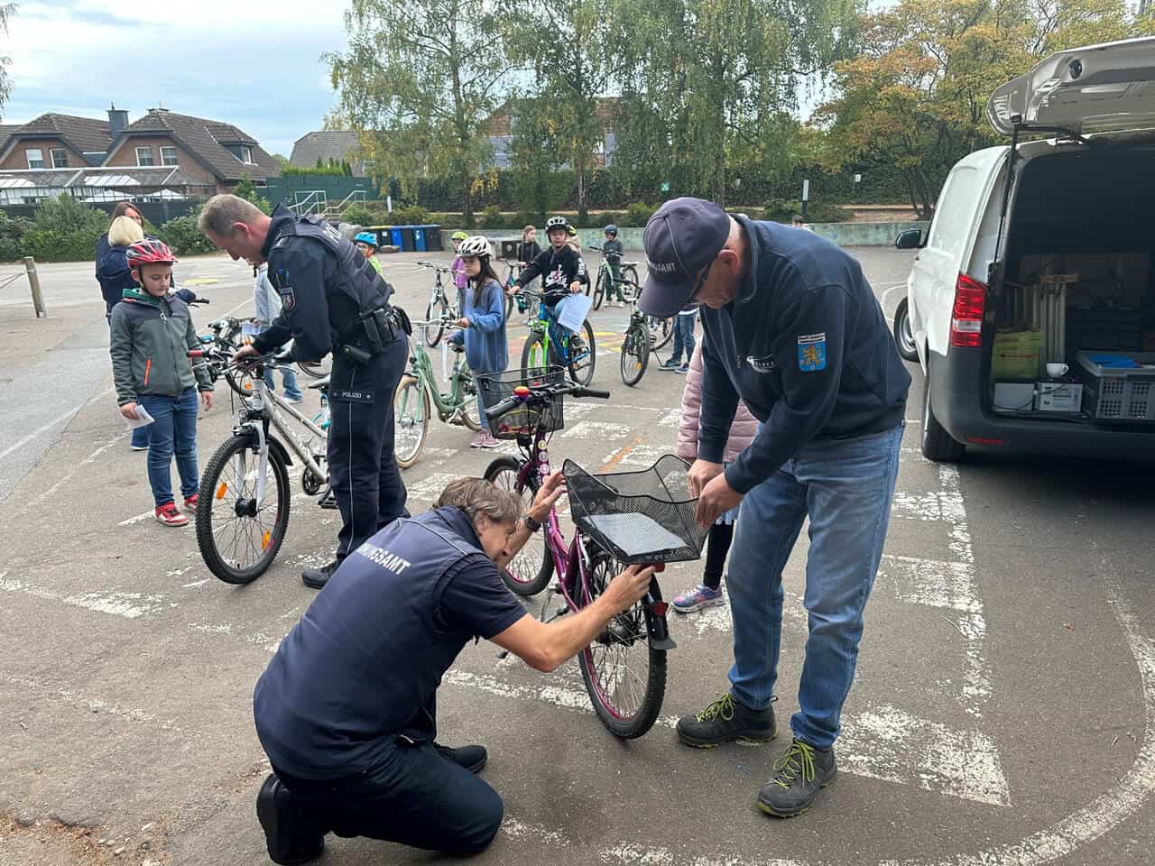 Besuch von einem Team der Kreispolizei und aus dem Bereich Ordnung der Stadt Geldern bekommen in diesen Tagen alle Gelderner Grundschulen. Ziel der Aktion: Rechtzeitig vor Beginn der dunklen Jahreszeit werden die Räder der Kinder auf ihre Verkehrssicherheit hin geprüft.