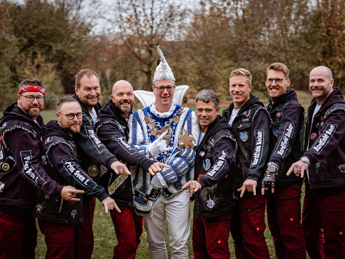 Freuen sich auf den ersten „Karnevalstrubel Blau-Weiß“ mit schottischer Pipe-Band in der Hartefelder „Dorfschmiede“: Blau-Weiß-Prinz Sven I. (Forthmann) und seine „Hardfield Rocker“.