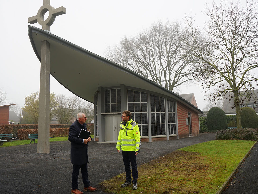 Jürgen Hüsken (rechts) von der Gelderner Baugesellschaft informierte Hartefelds Ortsbürgermeister Friedhelm Dahl vom Stand der Sanierung der Hartefelder Friedhofshalle.