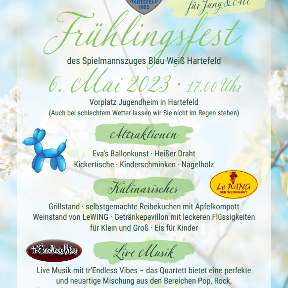 Frühlingsfest des Spielmannszug Blau-Weiß für Jung & Alt Wann? 6. Mai 2023 · 17.00 Uhr Vorplatz Jugendheim in…